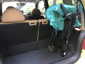 この大きめのベビーカーを軽自動車に乗せようと思うと、トランクスペースには絶対無理!助手席か後部座席の足元に置くのが定番となりました。