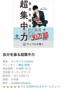 私が現在聴いているのが、メンタリストDaigoさんの「自分を操る超集中力」です!これは、毎日あれもこれもと忙しいママやパパには是非おすすめしたい一冊です!